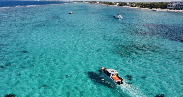 Your charter takes you along Seven Mile Beach and offers a front-row seat to the Caribbean’s most famous shoreline, where powdery white sand meets crystal-clear turquoise water. Cruise effortlessly past luxury resorts, stop for a refreshing swim, or relax on deck. It’s the perfect blend of laid-back island vibes and refined comfort, all enjoyed from the water. We’ll visit such spots as Eden Rock, the wreck of the Kittiwake, and Bonny Moon Beach Club.
